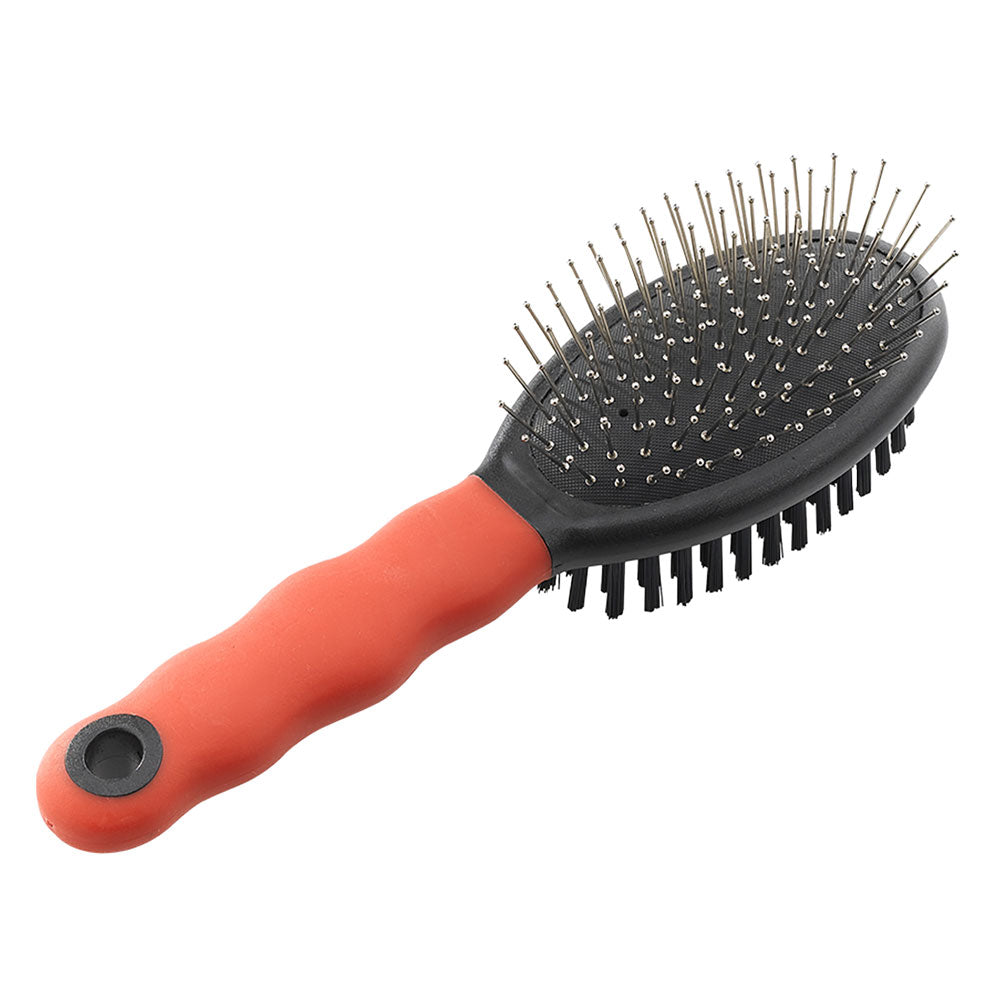 Indicata per la cura del manto. Per cani e gatti dal pelo corto, medio e lungo. Impugnatura in gomma. Setole in acciaio inox con punta arrotondata da una parte e setole mordide per favorire la lucentezza del pelo dall'altra.