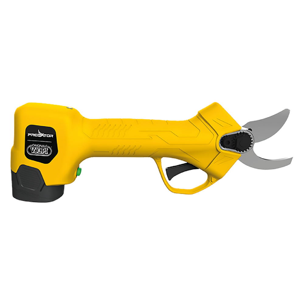 Per lavori di potatura su viti, arbusti, olivi. Con batteria litio ricaricabile, lame di taglio in acciaio e lama mobile intercambiabile. Motore brushless e sistema di movimento a ingranaggi. Funzione di spegnimento rapido stand-by. Potenza nominale 150 W, diametro massimo di taglio 20-22 mm. Autonomia 2-3 ore (in funzione del tipo di utilizzo). Peso 0,68 kg. Fornito con valigetta in cartone, 2 batterie, carica batteria, chiave manutenzione.
