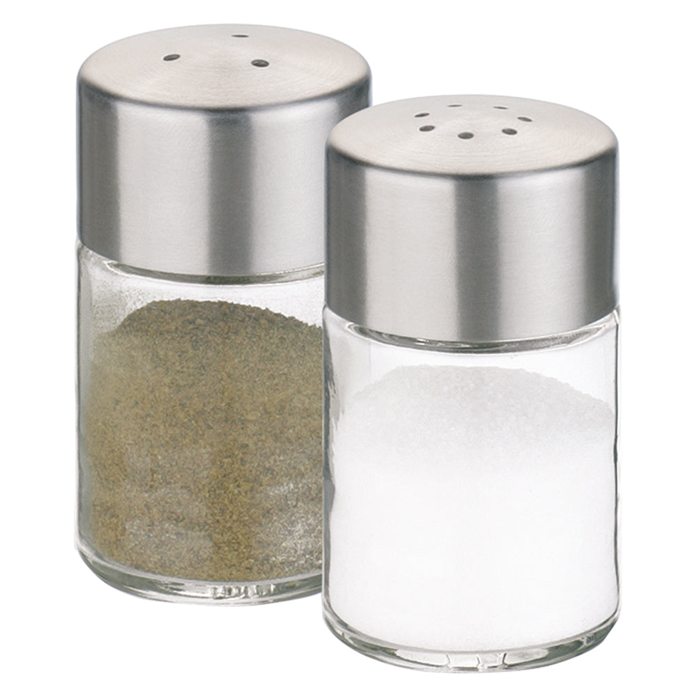 Mini set. Corpo in vetro e dosatori in acciaio, Ø 3,5 cm. altezza 6 cm. Lavabili in lavastoviglie, adatti anche per essere riposti in frigorifero.