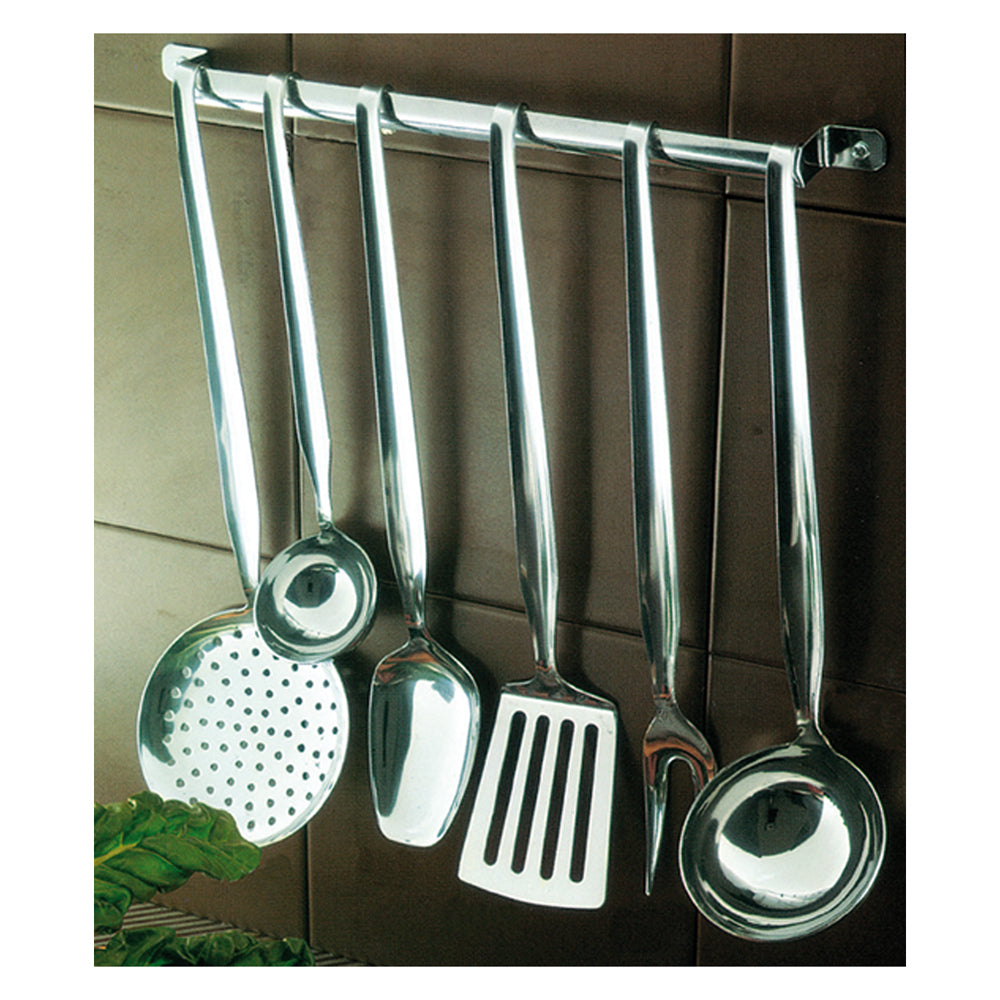 In acciaio inossidabile 18/10 di altissima qualità. Finitura lucida. Composizione: 1 mestolo cm.9, 1 mestolo cm.6, 1 schiumarola cm.11, 1 pala per fritti, 1 forchettone, 1 cucchiaione, 1 barra appendimestoli.
