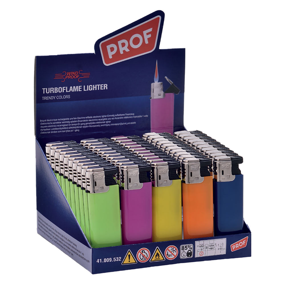 Elettronico, ricaricabile. A fiamma antivento turbo. Varie colorazioni, display in cartone. - Confezione da 50 pezzi