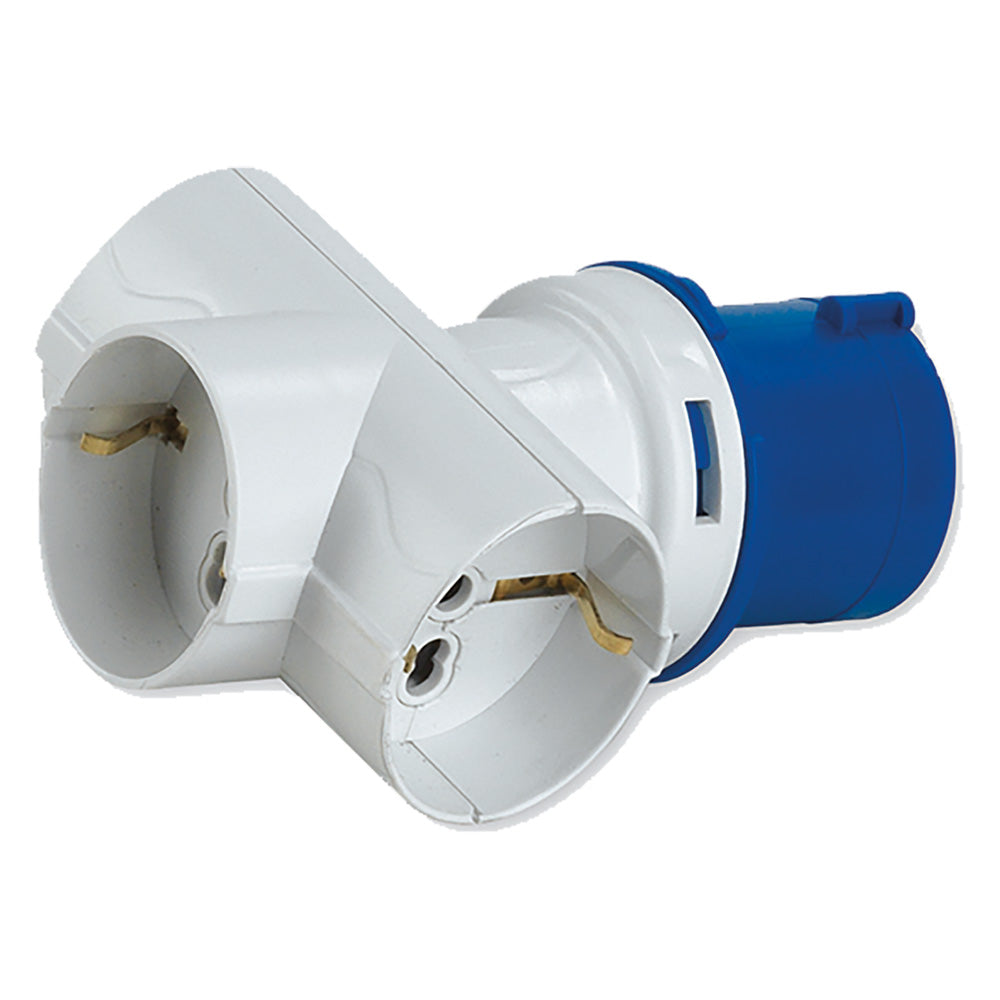 Spina: 2P + T 16A CEE blu - IP20. Presa: 2x2P + T 16A bipasso 1x2P + T 16 a bipasso schuko.
