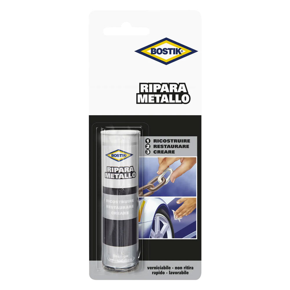 In stick. A base epossidica, indicato per riparare, saldare, ricostruire e stuccare metallo, ferro, alluminio, rame, ottone, bronzo, ghisa, piombo. Adatto anche per plastiche dure, tubi, valvole, serbatoi, parti di motore, batterie, arnesi di metallo, condotti per l'aria, parti di bici, moto ed auto, condotti tubature. Indurisce in pochi minuti. Colore grigio metallo.